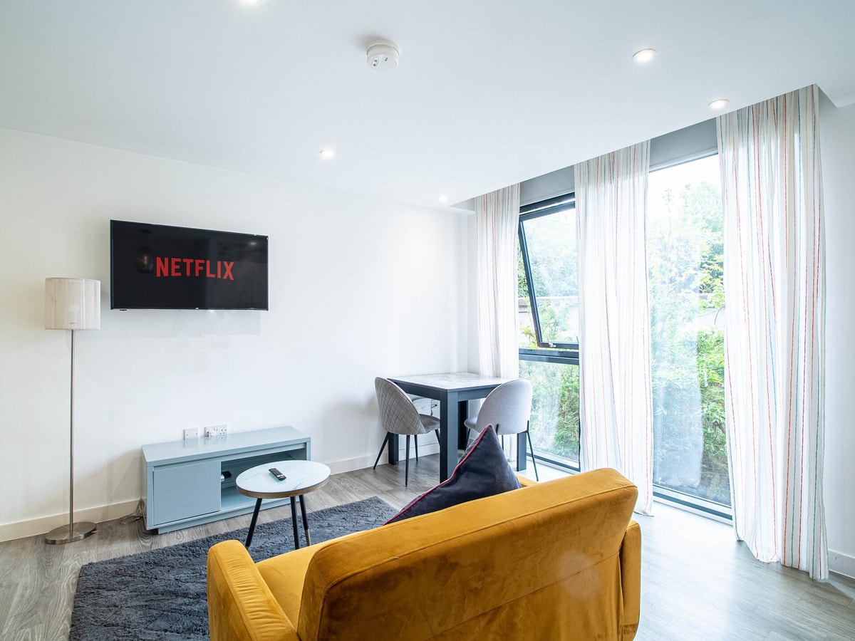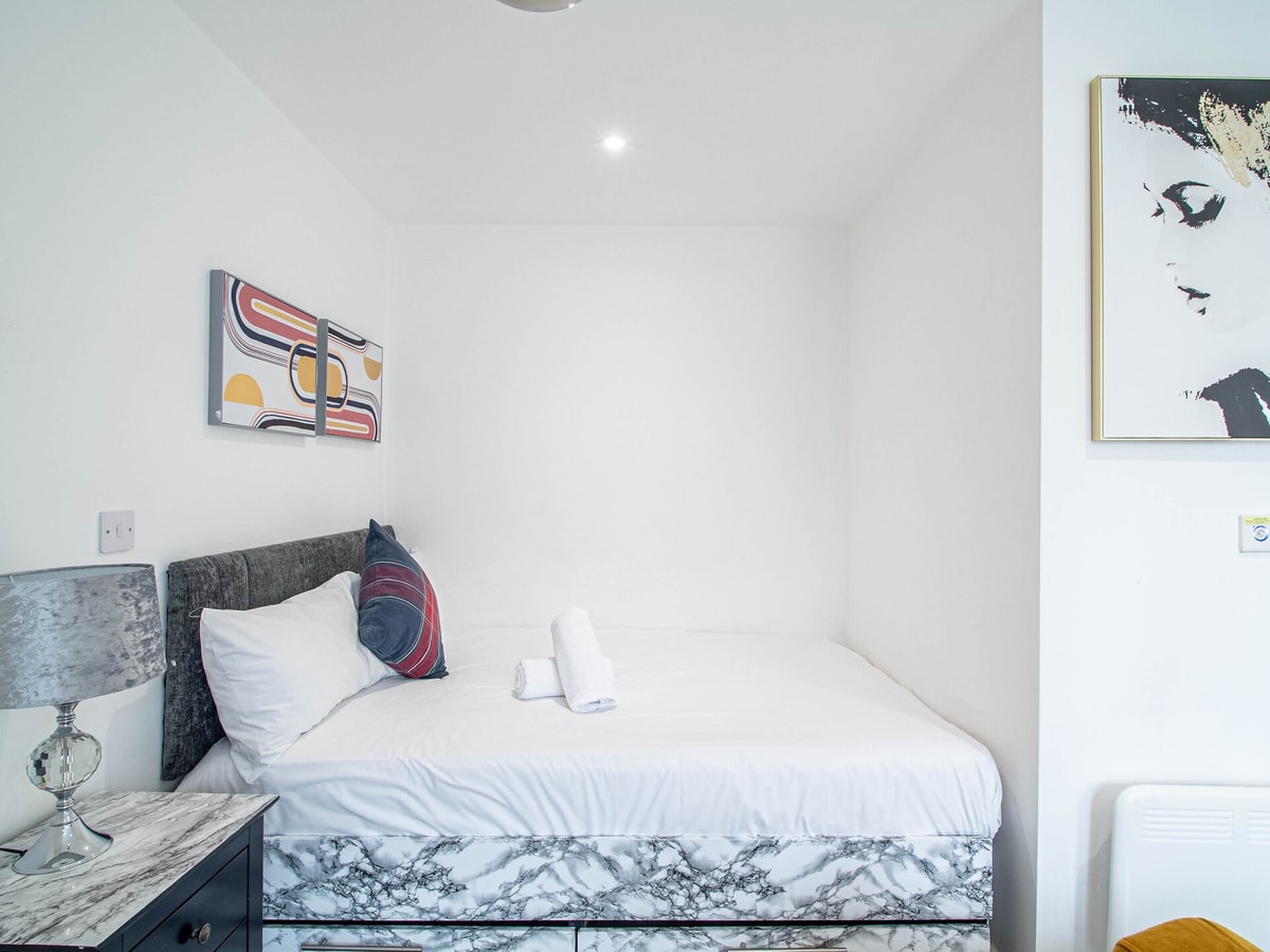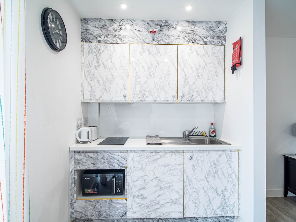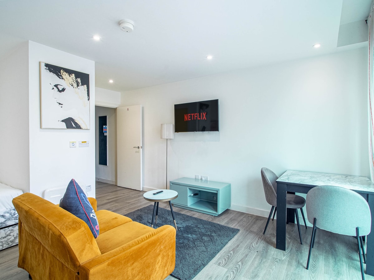 Bright and stylish, this cosy Sheffield studio offers a comfortable double bed, chic open-plan layout, and a fully equipped marble-style kitchen. Unwind on the plush velvet chair, stream your favourites on the Smart TV with Netflix, or catch up on work at the dedicated desk. Floor-to-ceiling windows flood the space with natural light. Perfectly located in central Sheffield—ideal for solo guests, couples, or business travellers.